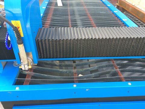 該型臺式數控切割機割臺部分采用龍門式數控切割機使用的扁鐵型割臺,其結構是用一定寬度80mm和厚度5mm的扁鐵(一般用鐵板剪切而成),相互平行排列組成。間距大小可根據常用下料板材厚度及零件大小來確定,一般為100-150mm。扁鐵在使用過程中是易損件,為便于更換,采用插入式結構。